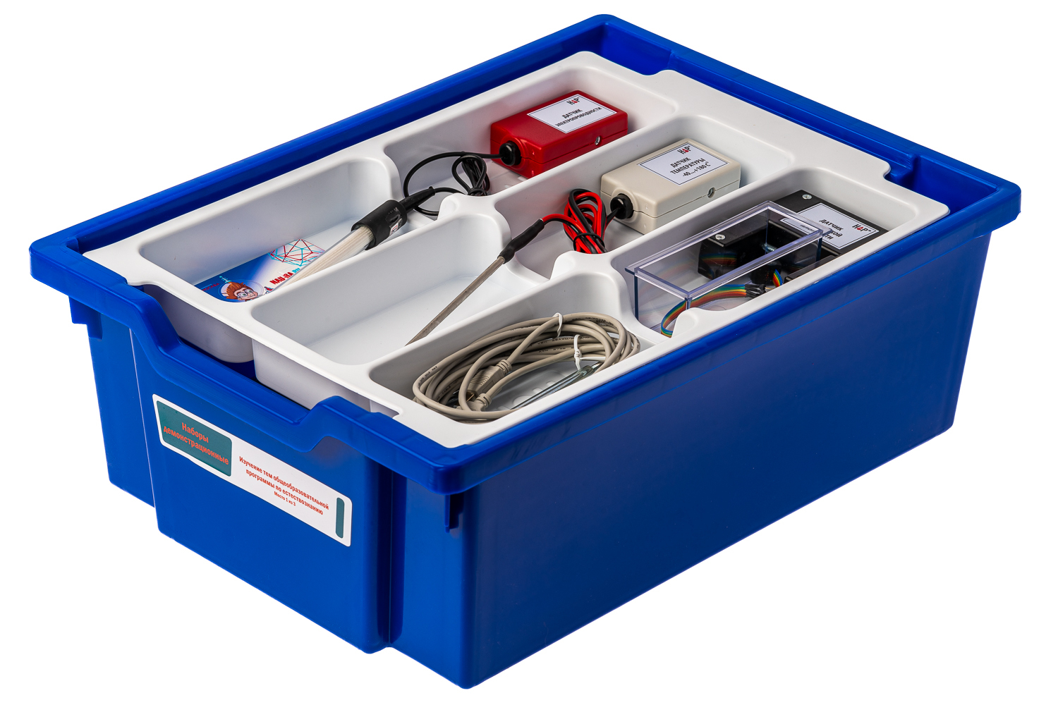 Цифровая лаборатория (за исключением микроскопа, набора препаратов, набора лабораторной оснастки и цифровой видеокамеры) укомплектована в пластиковую систему хранения, которая закрывается прозрачной пластиковой крышкой на защелках для обеспечения наблюдения за содержимым. Комплект оборудования и датчики в системе хранения располагаются на ложементе.