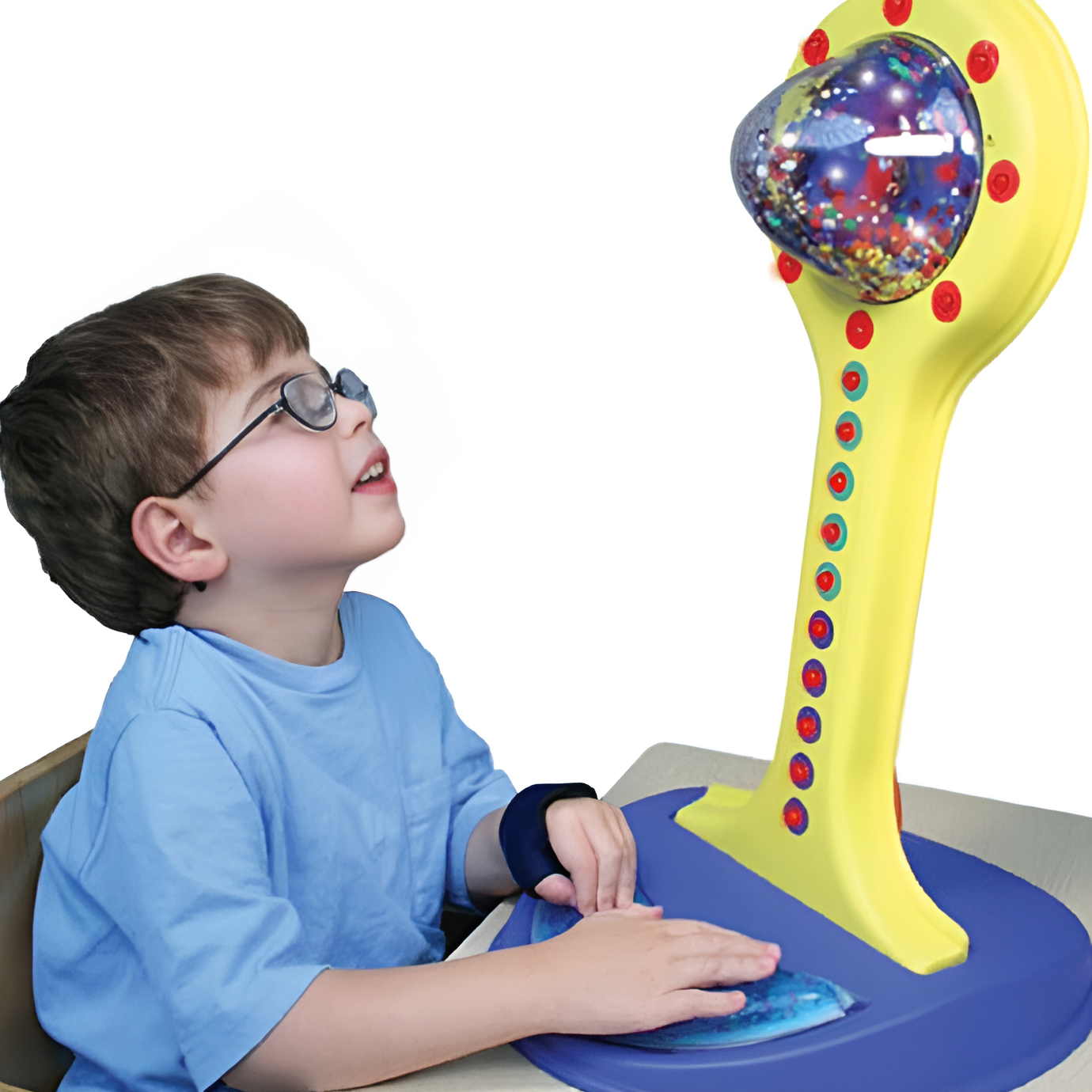 В зависимости от силы нажатия на гелевую подушечку появляются различные звуковые и визуальные эффекты: звучит музыка, загораются огоньки, начинают кружится разноцветные блестки под куполом.