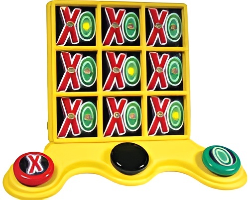 Нажимая на крупный цветной переключатель (красный или зеленый), вы делаете ход, и в черном квадрате загорается желтая лампочка. Нажатие на черную клавишу отменяет последний ход. Когда комбинация из крестиков или ноликов (по вертикали, горизонтали или диагонали) составлена верно, играет музыка и загораются разноцветные огни.