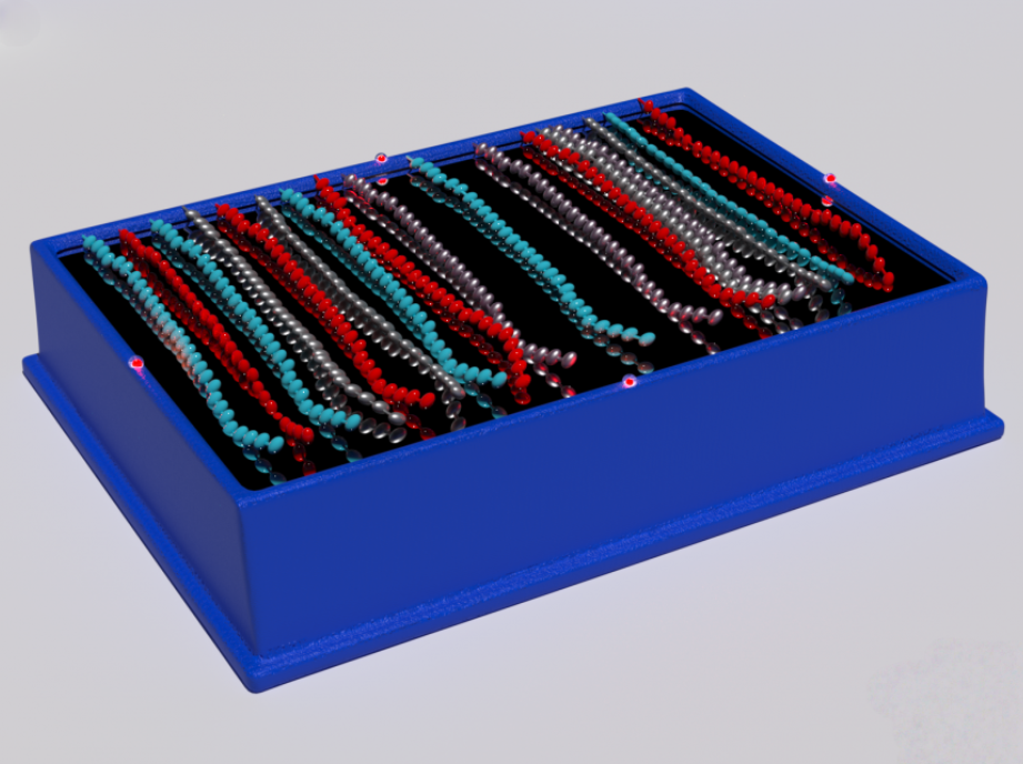 Представленное устройство создано для детей с ОВЗ. Предназначено для адаптационных и реабилитационных занятий; помогает развить мелкую моторику рук ребенка и утолить его сенсорные потребности, а также поспособствует улучшению навыков коммуникации. Корпус имеет форму рамки на подставке, внутри которой закреплено зеркало и цепочки из бусин; в верхней части рамки имеются светодиодные огоньки. Изготовлено из высококачественного ударопрочного пластика, имеет обтекаемые плавные формы без острых краёв и углов.