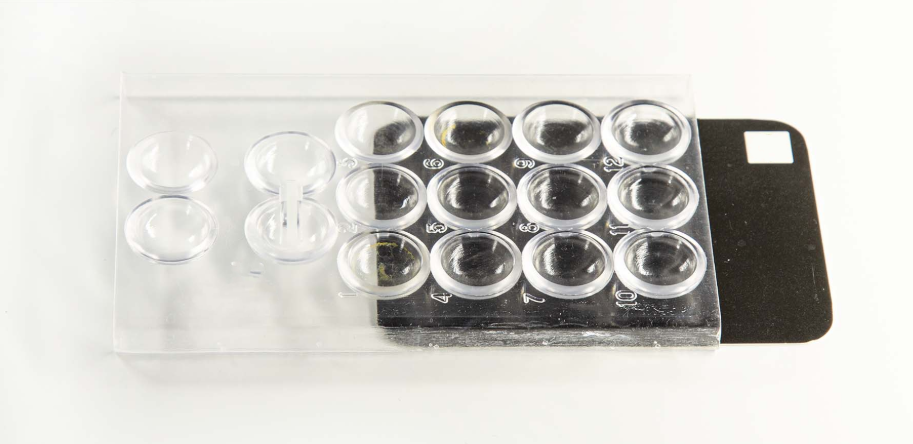 Планшетка для капельных реакций предназначена для проведения химических реакций капельным методом. Планшетка представляет собой пластину из органического с текла с 16 ячейками. Двенадцать пронумерованных ячеек предназначены для проведения капельных реакций. Четыре ячейки, две из которых соединены каналом, предназначены для опытов с электрическим током.
