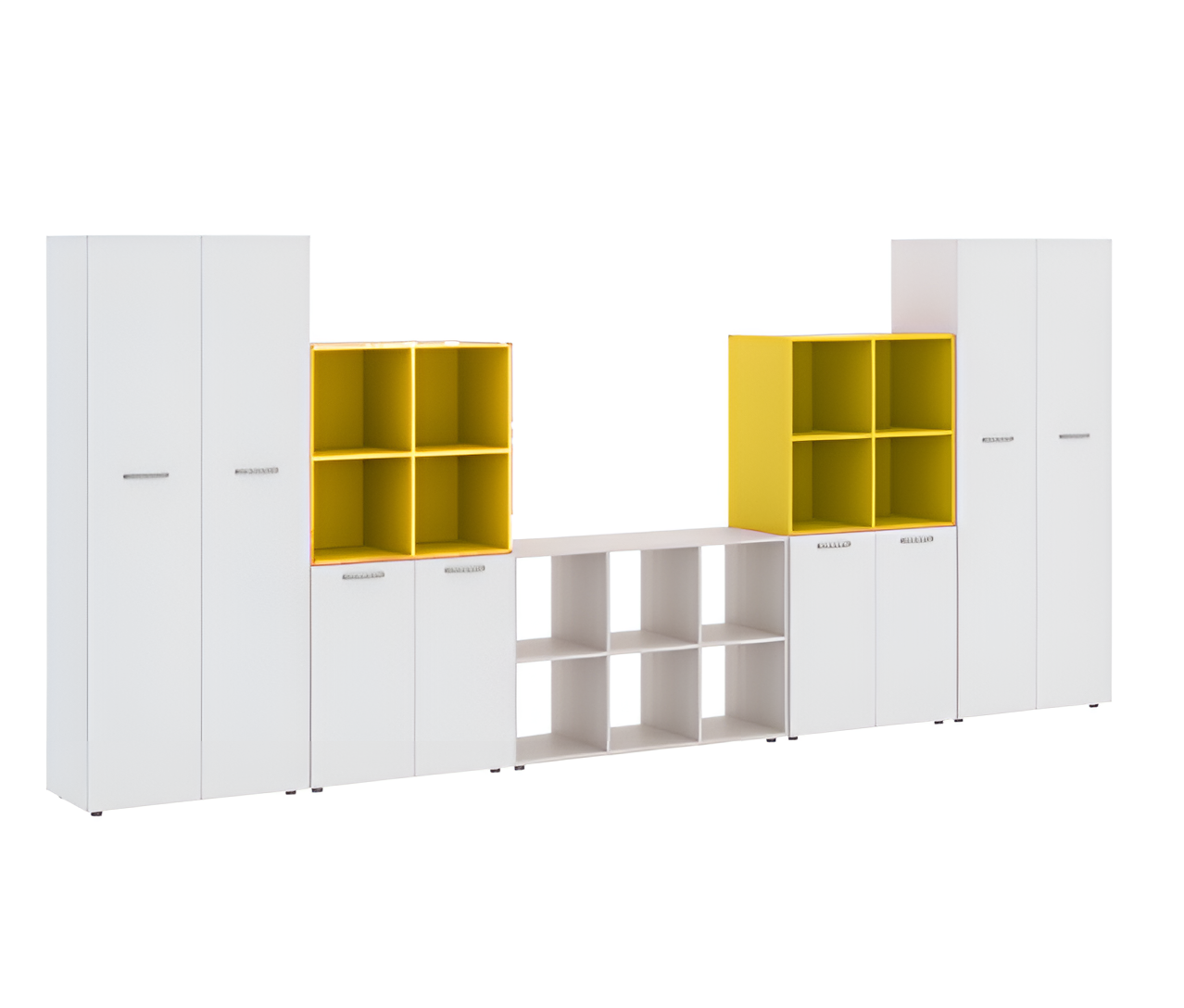 Шкаф модульный Multicab состоит из нескольких шкафов для одежды и открытых полок, оснащен регулируемыми ножками. Возможность выбора цвета вставок