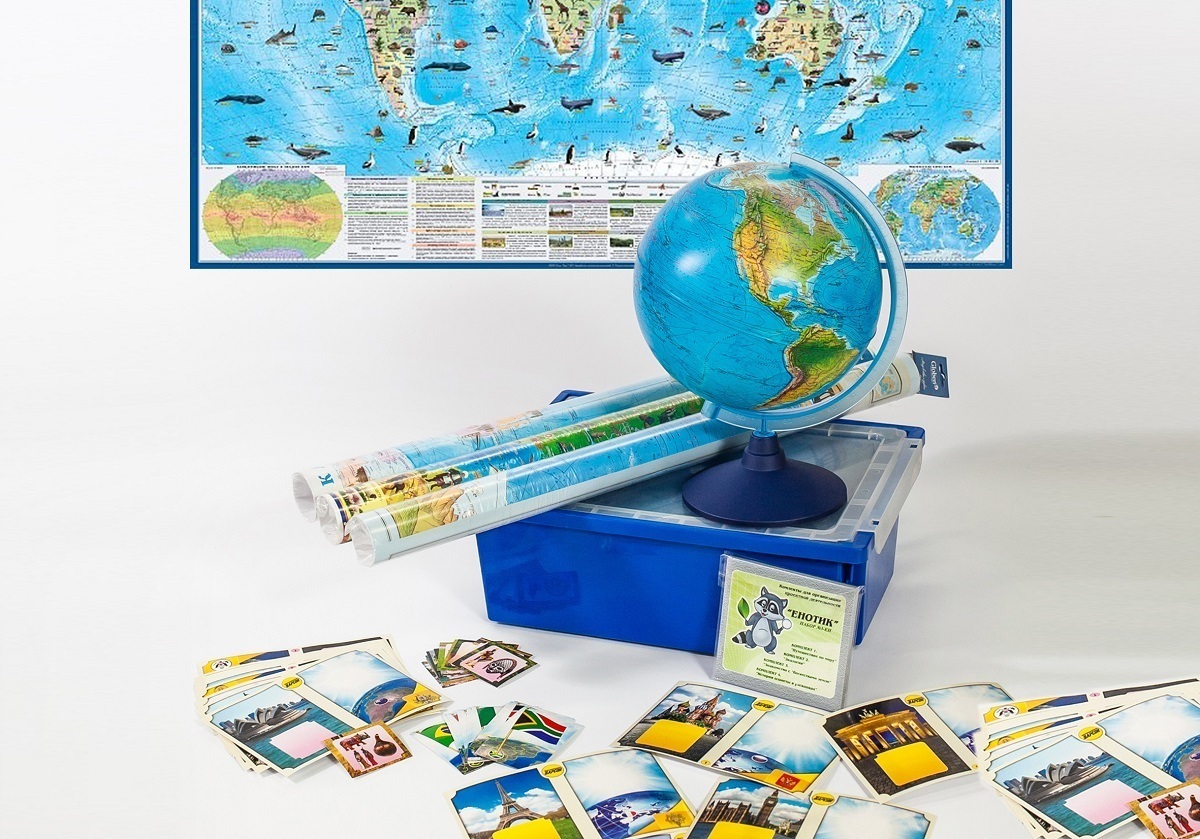 • Комплект № 1 «Путешествие по миру». В комплект входят наглядно-дидактические материалы для индивидуальной и групповой работы с детьми дошкольного возраста: глобус, карты, карточки с заданиями, видео-контент, журнал проекта.
