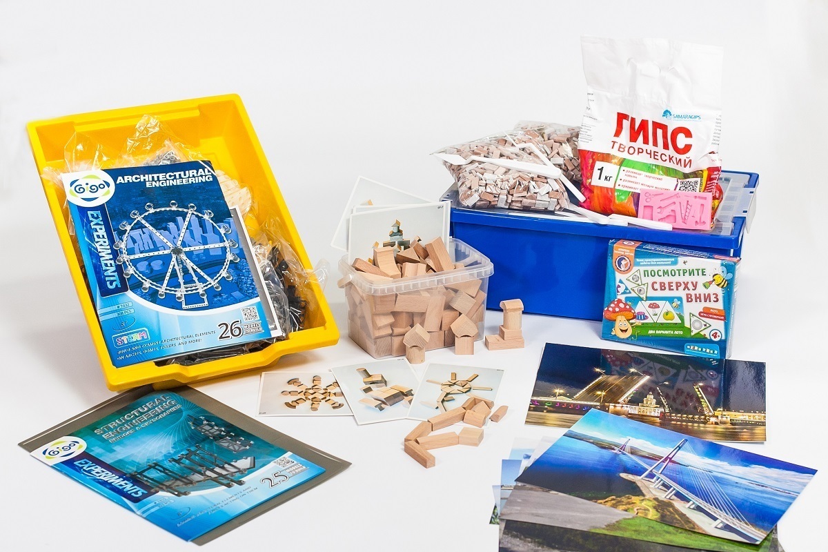 - Комплект № 1 «Архитектура». В комплект входят элементы для конструирования из различных материалов: дерево, пластик, бумага, карточки-схемы, набор инструментов «Юный архитектор», видео-контент, журнал проекта.