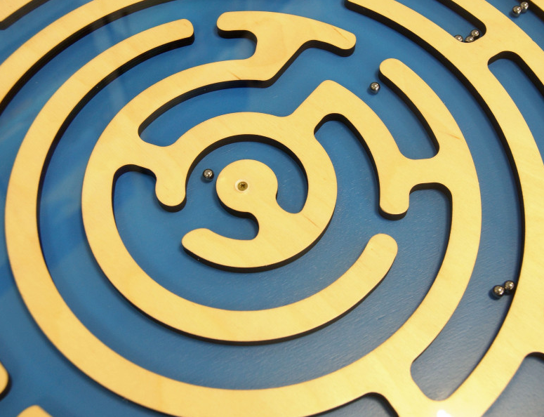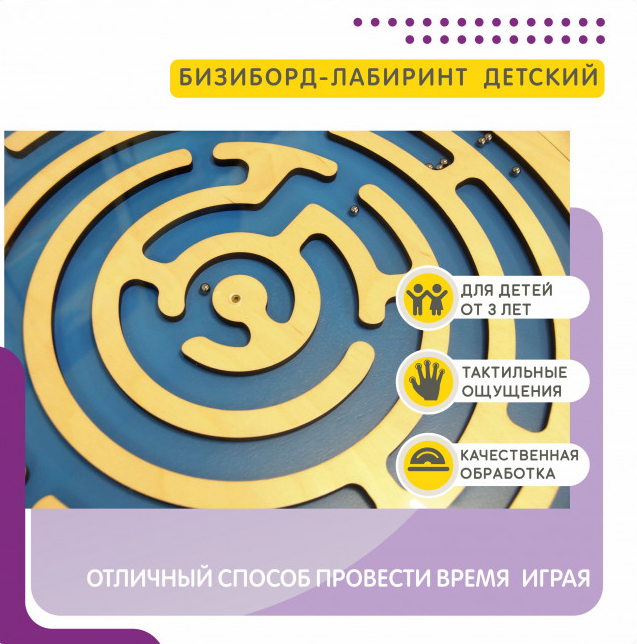Бизиборд-лабиринт – это игровой модуль, который помогает развивать моторику и логическое мышление у детей от 3-х лет. Основание модуля выполнено из древесины и имеет круглую форму. По всей поверхности основания расположен огромный лабиринт с металлическими шариками, который не только развивает мелкую моторику, но и улучшает координацию движений рук и глаз.