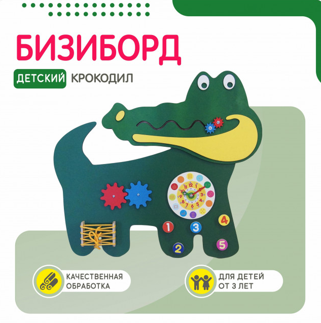 Бизиборд в виде зеленого крокодильчика прекрасно подойдет для занятий с детьми в дошкольный учреждениях, школах, а также детских центрах, радуя детей изо дня в день, как в большой компании, так и в одиночестве.