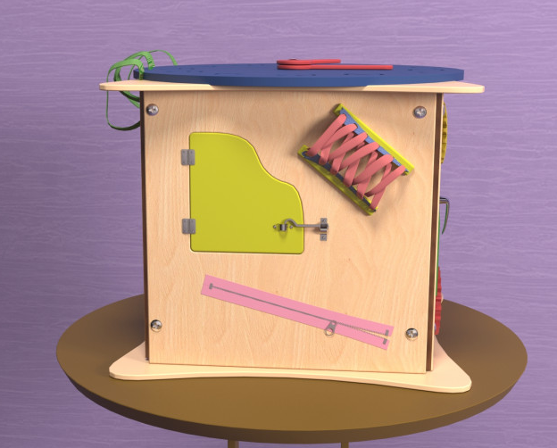 • Покажите ребенку, как работают элементы каждой из сторон бизикуба: сортер с геометрическими фигурками, лабиринт в виде дерева, передвижные фишки в форме яблок. Бизикуб позволяет повторить элементарные навыки в повседневной жизни: зашнуровать ботинки, застегнуть или расстегнуть кофточку, открыть или закрыть дверь. Таким образом, малыш становится самостоятельным.