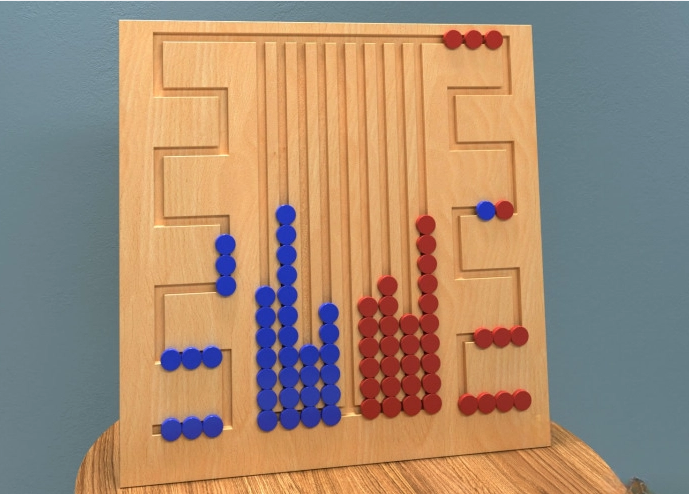 Перемещая разноцветные элементы внутри тактильного лабиринта по разным траекториям, ребёнок может сортировать их по цветам или распределять в произвольном порядке, таким образом развивая мелкую моторику и логическое мышление.