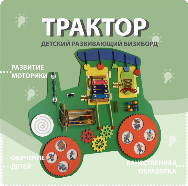 Настенная панель в виде трактора – яркий, красочный игровой элемент с дидактической ценностью. Многофункциональна и компактна. Представляет из себя фигурную деревянную доску в форме трактора, оснащённую разнообразными яркими элементами для приобретения детьми дошкольного возраста полезных навыков в формате игры.