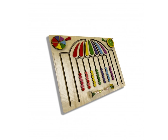 Перемещая разноцветные элементы внутри тактильного лабиринта по траектории с верхушки зонтика вниз (имитируя падение капель дождя), ребёнок может сортировать их по цветам или распределять в произвольном порядке. Счёты познакомят малыша с основами математики, а циферблат – с понятием времени.