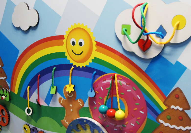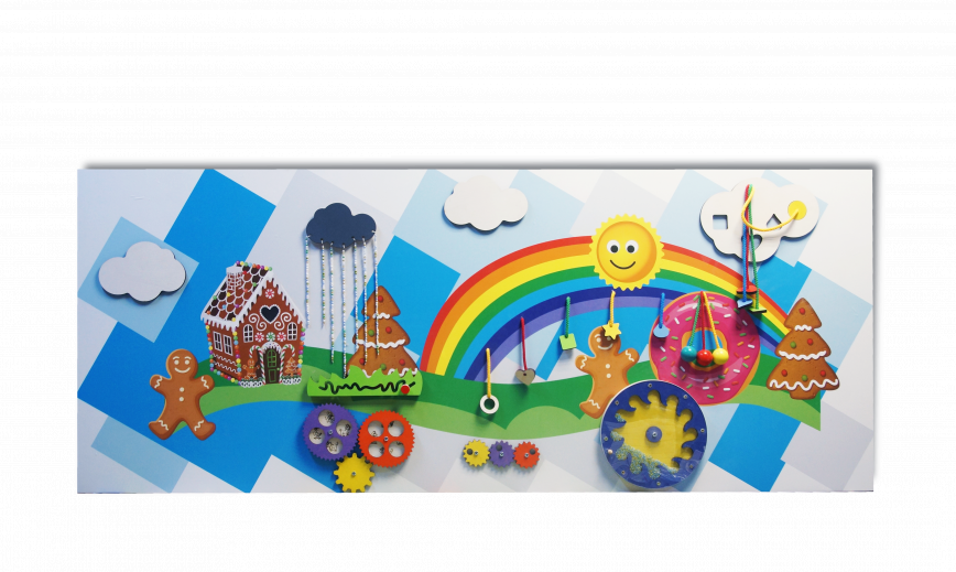 Настенная панель на тему веселых приключений - сказочная настенная игровая панель для весёлого времяпрепровождения малышей. Основание представленной модели имеет сложную многоугольную форму, выполнено в бело-голубой гамме, а игровые элементы выделяются на нём яркими акцентами.