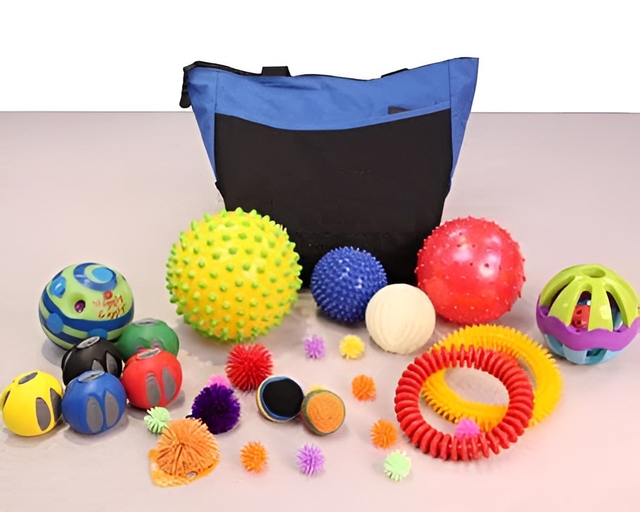 Набор терапевтических мячиков создан для повышения зрительного и тактильного восприятия. Для того, чтобы мячики можно было удобно переносить и хранить, в комплекте к ним идет специальная сумка.