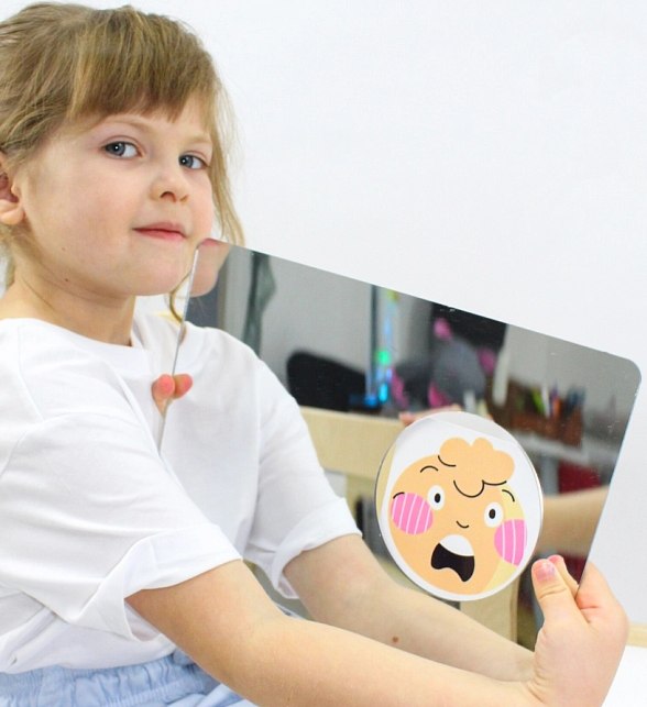 Во время изображения эмоций у детей повышается настроение, а логопед видит правильную или неправильную постановку языка и корректирует действия ребенка. Благодаря своему материалу зеркало является очень легким и безопасным, так как его невозможно разбить.