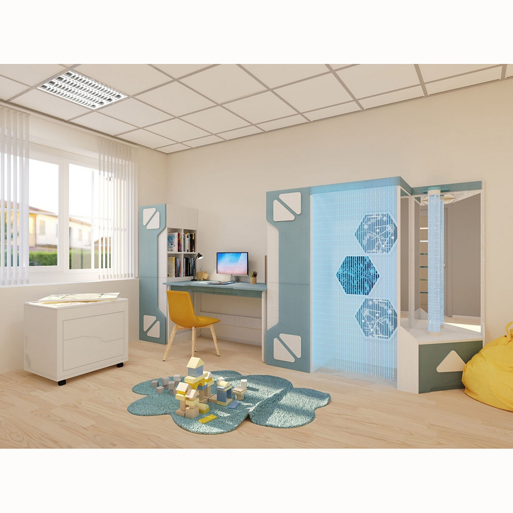 Комплекс включает встроенную световую песочницу, место под конструирование с мягким магнитным конструктором «МАККИ 37», место психологической разгрузки с фиброоптическим душем и воздушно-пузырьковой колонной, встроенную музыкальную систему и многое другое.