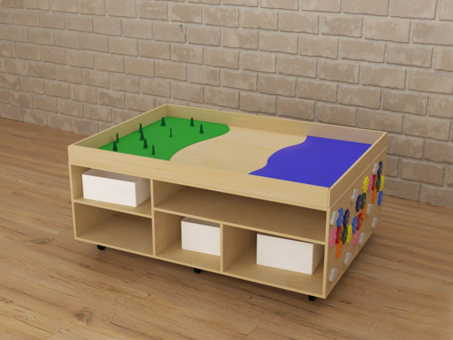 STEAM Многофункциональный стол с локациями моря, суши и леса – многофункциональный развивающий детский игровой модуль. Главное его преимущество – рациональное использование имеющихся площадей – на столешнице расположена ландшафтная локация, а на боках стола – развивающие элементы и полки-ячейки; это делает его необходимым элементом оснащения пространства для занятий с детьми. Стол имеет колёсики – это позволяет без труда перемещать его сколько угодно раз по помещению, не задействуя большое количество силы и не повреждая напольное покрытие. STEAM столы широко используются дошкольными педагогами и некоторыми узкими детскими специалистами – логопед, дефектолог, психолог – для групповых и индивидуальных занятий с детьми дошкольного и младшего школьного возраста.