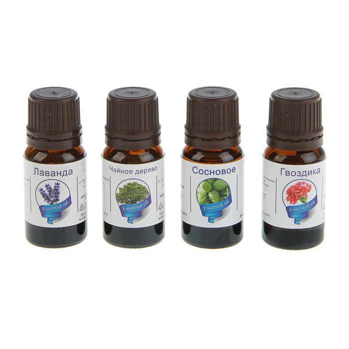 Эфирные масела лаванды, чайного дерева, гвоздики, сосны, расфасованные по 10 мл, в сопровождении аннотаций на каждое масло.