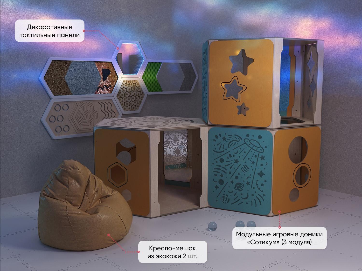 Модульные игровые домики «Сотикум» – трансформируемые игровые модули, в которых легко спрятаться и представить себя в уютном гнёздышке или укромной норке. Это важно для создания безопасного пространства для ребёнка, установления с ним доверительного контакта. Дополнительно домики оформлены развивающими тактильными панелями.