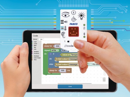 Беспроводной цифровой модуль для программирования //code.Node посредством технологии Bluetooth 4.0 подключается напрямую к переносному устройству – смартфону, планшету или ПК, - а сбор, отображение и анализ данных осуществляется в программном обеспечении PASCO SPARKvue или Capstone.