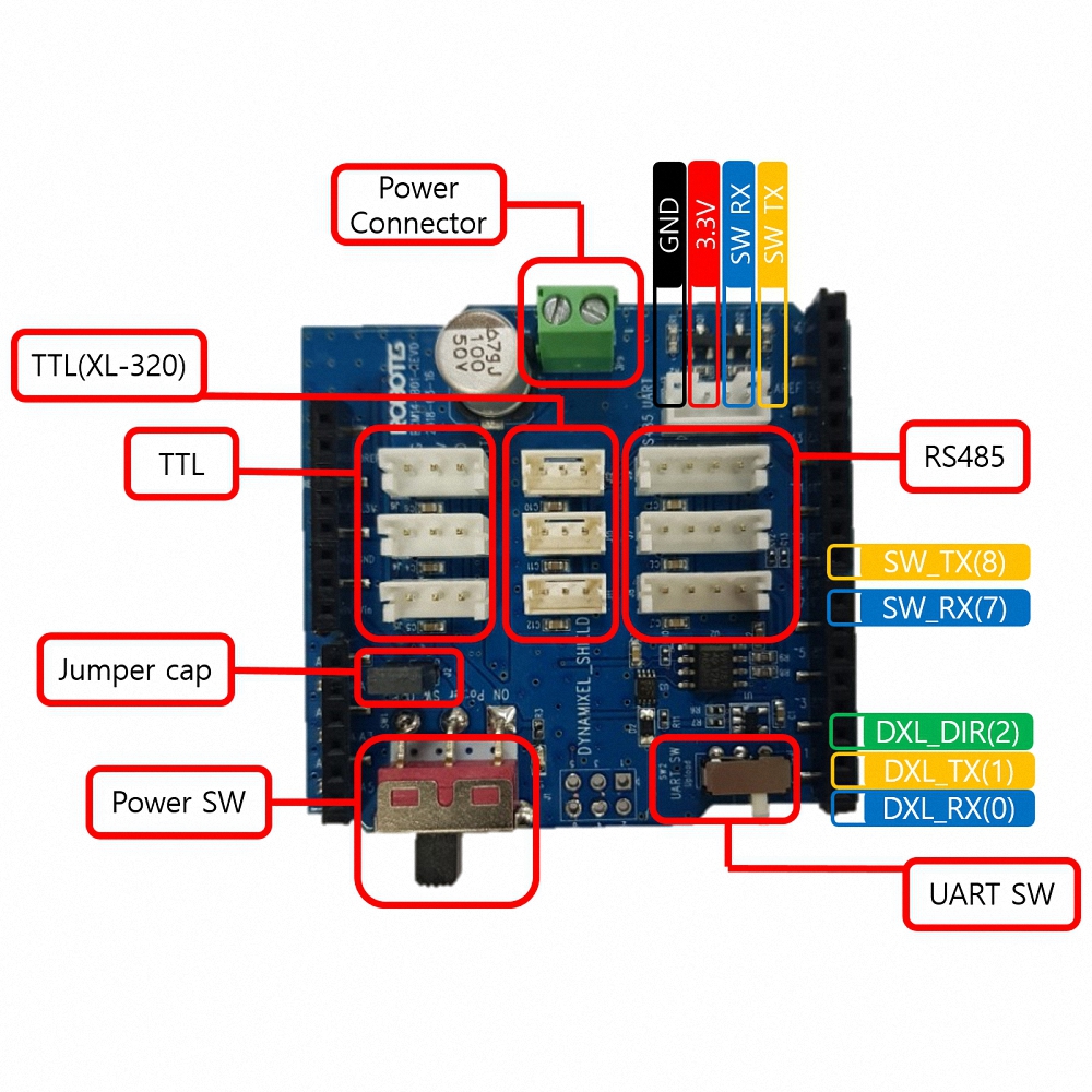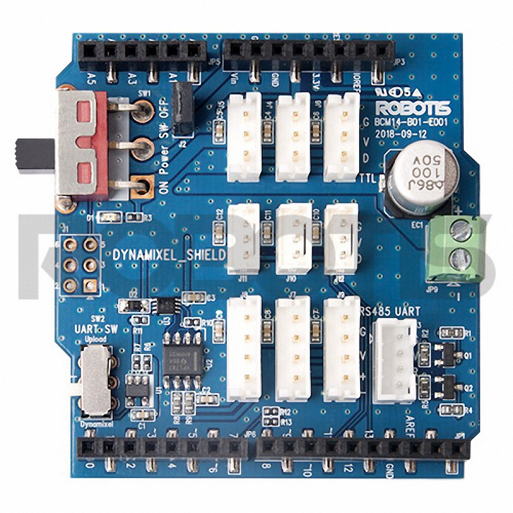 На плате расширения Dynamixel Shield присутствуют разъемы типа JST и XL-320. Поддерживаются интерфейсы TTL и RS-485. Также на Dynamixel Shield могут быть установлены дополнительные платы расширения.