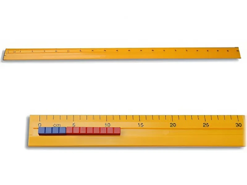 Линейка размером 103*5 см изготовлена из пластика. Вдоль линейки сделан желоб шириной 11 мм для выкладывания счетных элементов. С левой стороны желоба установлен ограничитель. Над желобом нанесена сантиметровая разметка с оцифровкой через пять сантиметров.