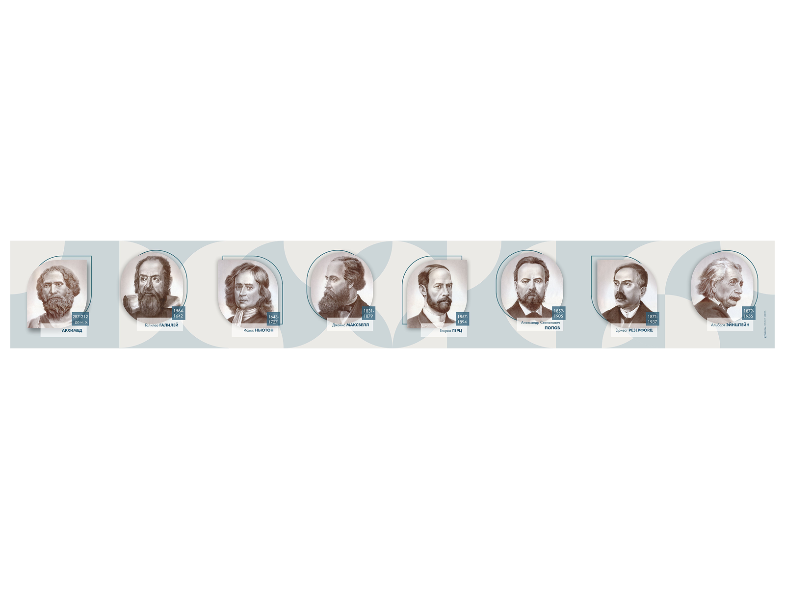 Стенд-лента представляет собой панель, на которой размещена информация о выдающихся ученых-физиках.