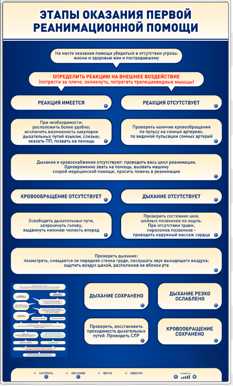 В режиме "Контроль" сотруднику предоставляется возможность проверить и закрепить полученные знания. Тестируемому необходимо составить верный алгоритм оказания помощи пострадавшим в различных ситуациях. Каждое несоответствующее алгоритму действие отмечается мигающей подсветкой выбранного пункта и зажиганием красного светодиода "неверно" внизу панели стенда. Зажигание зеленого светодиода "верно" говорит о том, что пострадавший реанимирован.