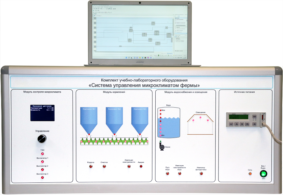 Комплект учебно-лабораторного оборудования «Система управления микроклиматом фермы» предназначен для проведения практических и лабораторных работ по изучению общего устройства и основных характеристик, принципов функционирования и режимов работы системы управления микроклиматом фермы.