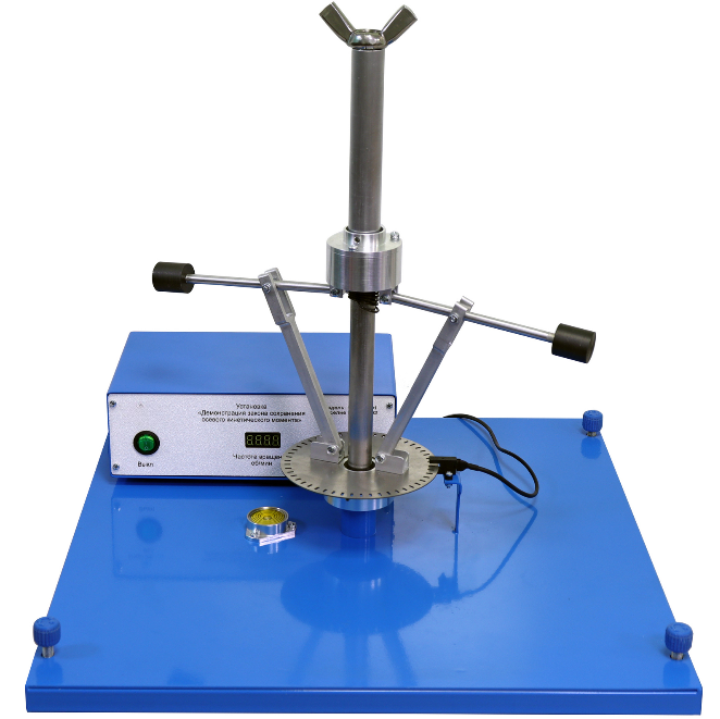 Лабораторная установка предназначена для демонстрации закона сохранения осевого кинетического момента вращающейся системы, определения осевого кинетического момента механической системы.