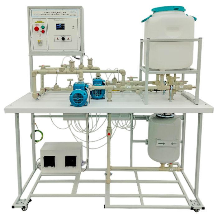 В системе располагается технологический бак, позволяющий производить лабораторные работы не подключая стенд к сети водоснабжения и канализации лаборатории. В системе располагаются два центробежных насоса. Система трубопроводов и задвижек позволяет подключать из как последовательно, так и параллельно.